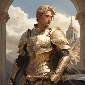 - Handsome blonde haired human male with green eyes dressed in full plate armor with a shield adorned on his back and a longsword sheathed on his side.